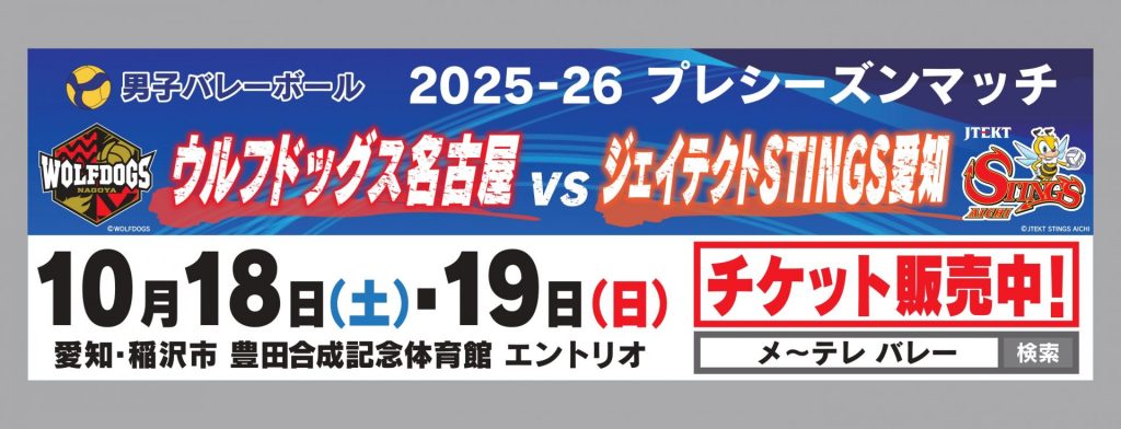 2025/09/19 AVA メーテレ主催、愛知ダービー開催のお知らせ ウルフドッグス名古屋とジェイテクトSTINGS愛知による愛知ダービー開催のお知らせ 2025−26プレシーズンマッチ ウルフドッグス名古屋 vs ジェイテクトSTINGS愛知 〜シーズンはここから始まる〜が、10月18日(土)、19日(日)に豊田合成記念体育館エントリオでメーテレ主催により開催されます。 詳細はこちらをご覧ください。 https://www.nagoyatv.com/program_event/preseason-match.25.html シェア シェア 新しい記事 お知らせ一覧へ戻る 古い記事 お知らせ一覧へ戻る